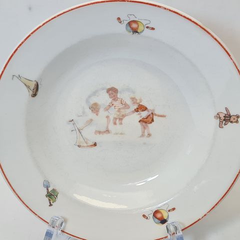Arabian Lasten lautanen " Tytöt", suunnittelija Raija Uosikkinen, lautanen on 1960-luvulta, kulumaa ja käytönjälkiä löytyy, mutta ei yhtään lohkeamaa. Halkaisija on 19.5 cm ja kork 3.5 cm.