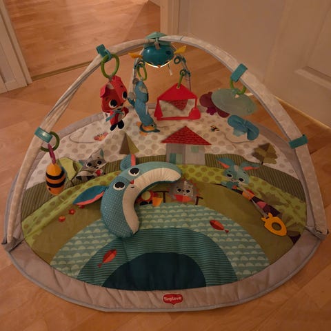 Värikäs tiipiin mallinen leikkimatto. Mukana kolme roikkumaan laitettavaa lelua, joissa peili, musiikkia ja helistin söpöissä eläin kuoseissa, lisäksi karhutyyny/tuki. Pörriäinen puuttuu ja peilipinta on leikeissä jo naarmuuntunut. Pesin maton ja lelut käsin, joten myydään peruspuhtaana.