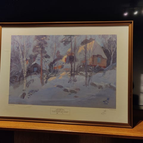 Kari Suomalainen "Visavuoren syksy" 231/500 sig. Valkeakosken kirjapainossa painettu taidejäljennys 1983, mitat kehysten päältä korkeus n.52cm leveys n.67cm kuva-ala n.33x49,5cm (Alkuperäinen guassi maalaus)