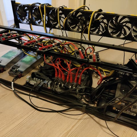 Ylimääräiseksi jäänyt mining/louhinta rigi avokotelo/teline. Teline hyvässä kunnossa ja tekee mitä pitääkin.