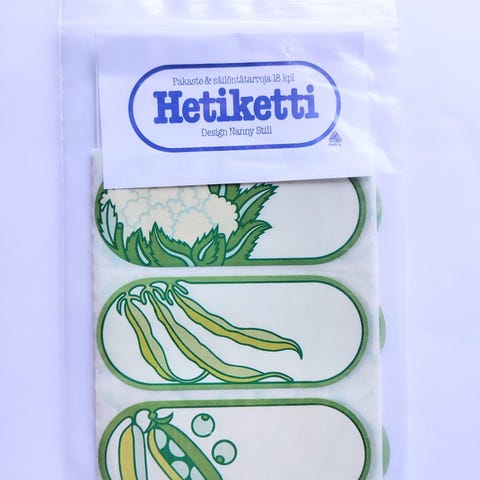 Hakusanat: Nanny Still, design, suomalainen design, retro, 70-luku, 80-luku, 90-luku, säilöntä, marjastus, marjat, säilöntätarra, tarrat, tarroja, mehustus, savustus, kasvimaa, graavilohi, hilla, hillastus, sienestys, omenahillo, kasvihuone, pakastus, pakastustarra, Pakaste & säilöntätarroja 18 kpl, Avery, Lindel, etiketti, etiketit, tarra, keräily.