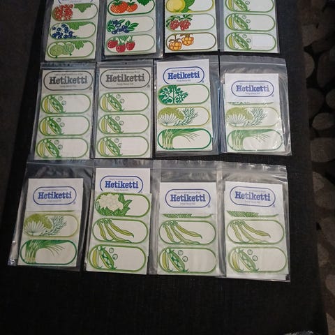 Hetiketti-tarrapakkaus, jossa 18 tarraa, hyvä tarttuvuus, lähtevät myös siististi pois erilaisilta pinnoilta, yhden tarran koko n. 9,8 x 4 cm, avaamattomia pakkauksia, yhdessä pakkauksessa aina kolmea eri aihetta ja niitä jokaista 6 kpl, näitä on useita pakkauksia, 2 e/pakkaus