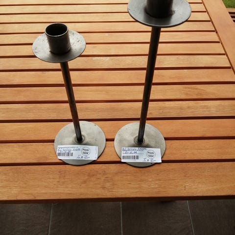 2 messinkistä kynttilänjalkaa. Korkeus 11 cm. Painavia. Käytön jälkiä löytyy jonkin verran. Pohjassa teksti DANSK DESIGNS FINLAND. Kynttilä ei tule mukaan