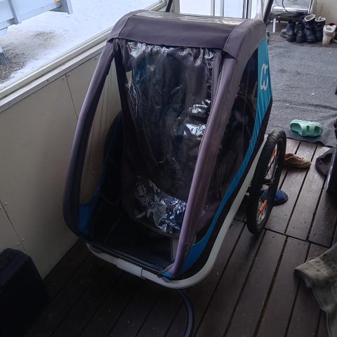 Yhdenistuttava hyväkuntoinen pyöräkärry. Kärryssä ominaisuuksina mm. seisontajarru, häikäisysuoja, hyönteisverkko edessä, ja jousitus. Pyörät saa irrotettua kuljetusta varten.
