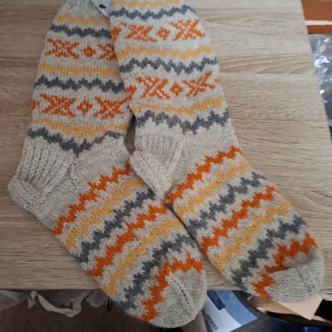 Myyntiin itse neulomat villasukat, käy jalkaan 39-40. Varren kork. 12cm, kantapää-kärki 24cm. Postitus onnistuu kirjeenä 3e.