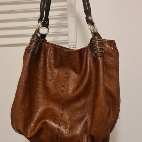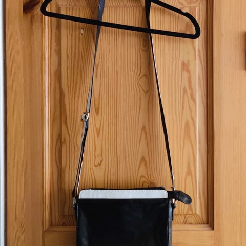 Nahkalaukku. Olkahihna ja laukun pohja keinonahkaa, itse laukku nahkaa