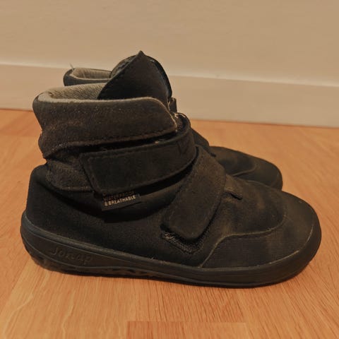 Jonapin nahkaiset välikausi paljasjalkakengät. Koko 29, sisämitat 19cm/7,6cm (jälleenmyyjän sivuilta). Unohtuivat kaappin kun meillä oli toiset vk-kengät samaan aikaan käytössä. Säilytyksessä tullut muutamia jälkiä harmaisiin osiin.