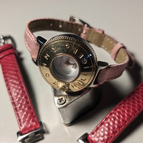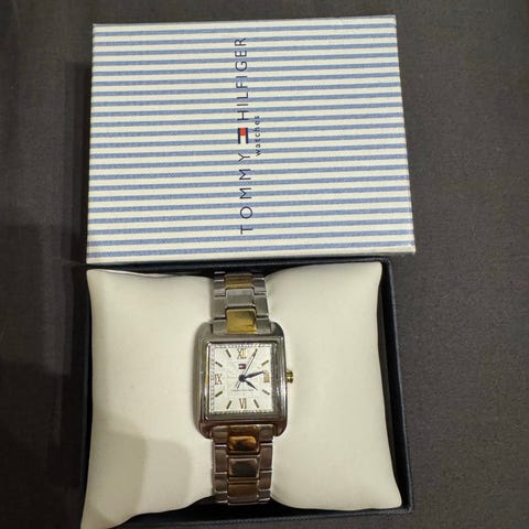 Myydään naisten Tommy Hilfigerin rannekello, hyvä kuntoinen. Kellossa nahkainen ranneke sin./pun. Rannekkeet pystyy vaihtamaan kts.kuvat. Kellotaulun koko 3x2 cm. Patteri vaihdettu hiljattain. Alkuperäinen laatikko tulee mukaan. Lisäkuvia pyytämällä.