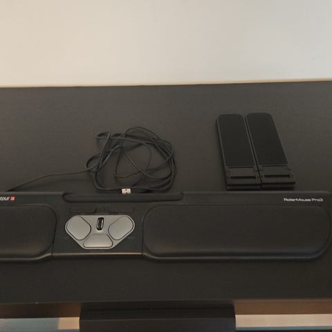 Hyvä ja toimiva rullahiiri. Pientä epäsiisteyttä, ei näytä luonnossa läheskään niin pahalta kuin kuvassa (läpinäkyvää liimaa mennyt pehmusteelle). Lataus johto puuttui.
