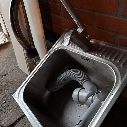 Teräksinen keittiöallas, jossa on kaksi allasta ja kromattu hana.