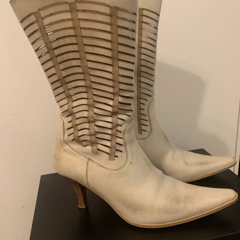 Vanhat, mutta vain muutaman kerran juhlissa käytetyt saappaat. Pieniä halkeamia nahassa muutamassa kohdassa, jotka vain läheltä katsottuna näkyvät. Jääneet itselle pieniksi raskauksien myötä. Pohkeiden kohdalta melko kapeat.