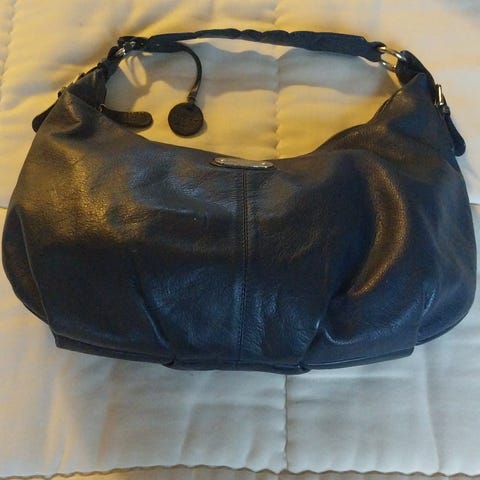 Sininen tilava olkalaukku nahkaa