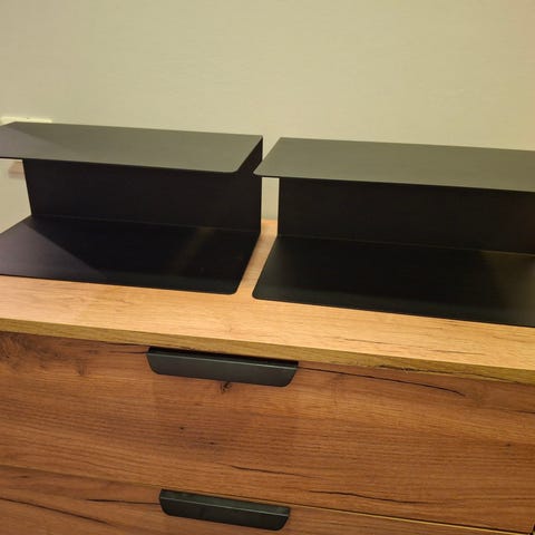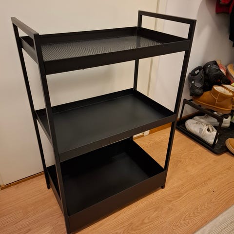 Metallinen 3-tasoinen hyllykkö valkoisella pinnalla. Hyllykkö koostuu kolmesta tasosta, joissa on reikäkuvioidut reunat. Soveltuu säilytykseen ja järjestelyyn eri tiloissa.