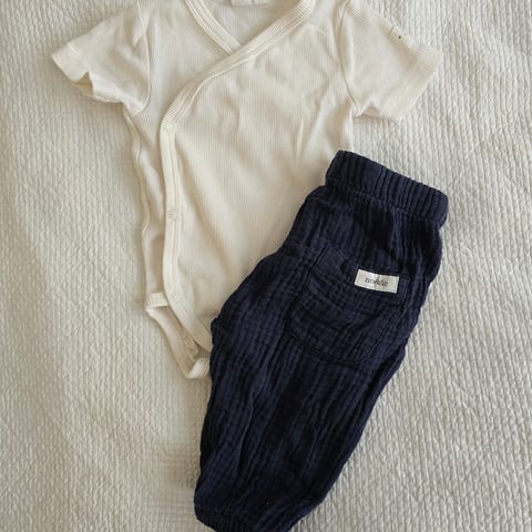 Newbien body ja tummansiniset musliinihousut, koko 62. Molemmat erinomaisessa kunnossa.