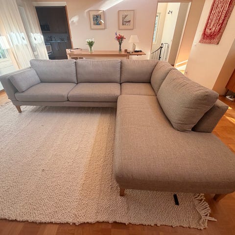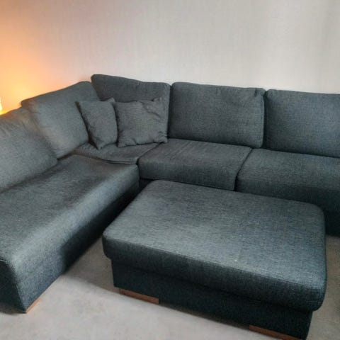 Maskun kalustetalon laadukas kulmasohva vaaleanharmaalla kulutusta hyvin kestävällä ja muotonsa pitävällä kankaalla. Istuinpääliset irrotettavia ja pestäviä. Yhdestä päälisestä vetoketju hajonnut, mutta ei näy käytössä.