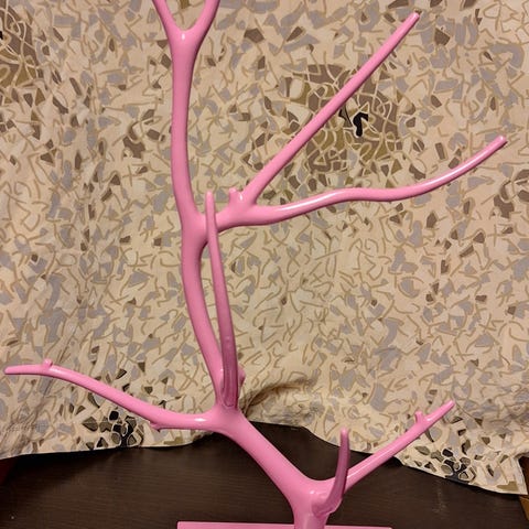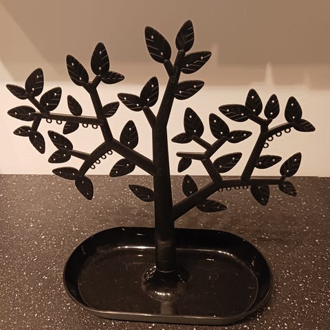 Kaunis musta metallinen korupuu. Paljon tilaa koruille. Mitat: korkeus 69cm ja jalustan leveys 18cm.