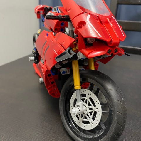 LEGO Technic Ducati Panigale V4 R moottoripyörän rakennussarja, jossa punainen väri ja yksityiskohtaiset tekniset ominaisuudet. Sopii rakentajille, jotka ovat kiinnostuneita moottoripyörämalleista ja teknisistä rakennussarjoista.
