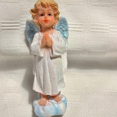Kaunis enkeli on on valmistettu kankaasta ja pää on keraaminen. Enkeli on jo vanha ja ostettu aikanaan sisustusliikkeestä. Siinä on myös ripustuslenkki ripustusta varten. Kooltaan n. 15 cm.
