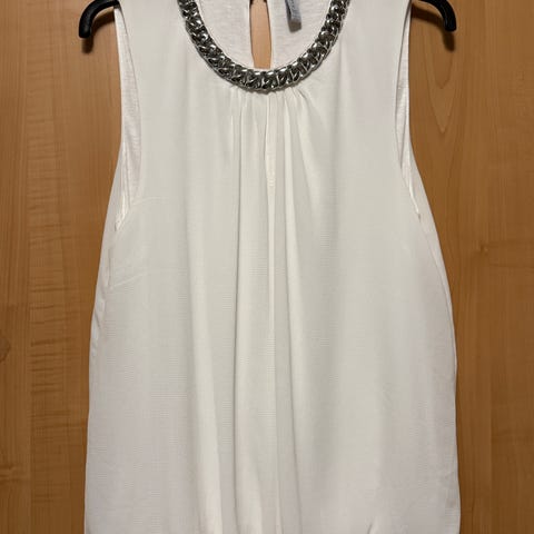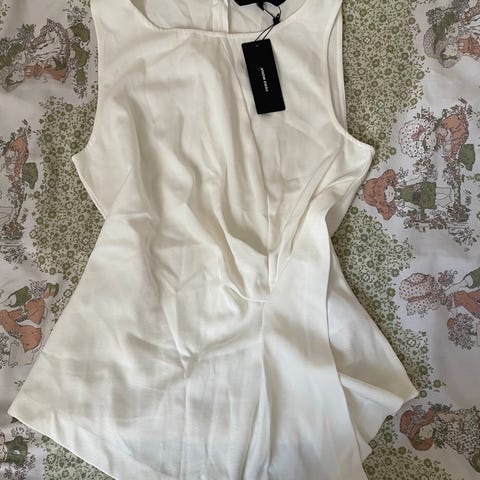 Valkoinen monikerroksinen pusero suurilla hihoilla.