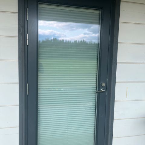 Toimiva osittain lasitettu valkoinen terassin ovi karmeineen 880x2270, Ovessa on sälekaihdin ja karmissa on neljä saranaa, lukitus sisältäpäin