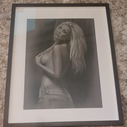 Kehystetty mustavalkoinen taulu, jossa alastonkuva. Taulun koko A3 ja mukaan aitoustodistus.