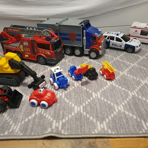 4 ajoneuvoa, helikopterilla oli valo- ja äänitoiminta, en koittanut vaihtaa patterit. Trukilla haarukat rikki, push back toiminta. Saab on metallinen. Monsteti autolla etupyörät kääntyy.