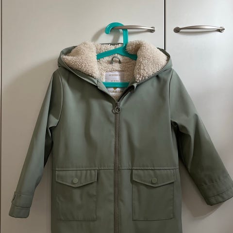 Tumma vihreä sadetakki jossa huppu, heijastimia ja vetoketjulliset taskut. Kokolappua ei ole, kokoarvio noin 150 vai 160? Katso mitat!