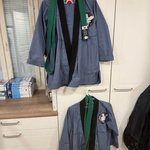 Myynnissä valkoinen Sin Moo Hapkido puku, paksumpaa kangasta.