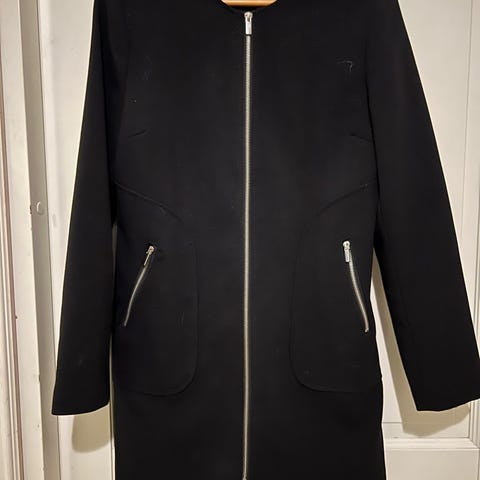 Ellos musta naisten villakangastakki, koko 40. Takki on valmistettu 49% villasta, 44% polyesteristä ja 7% muista kuidusta. Takissa on napit edessä ja kaksi feikki etutaskua. 170 cm pituiselle takin helma tulee polviin asti.
