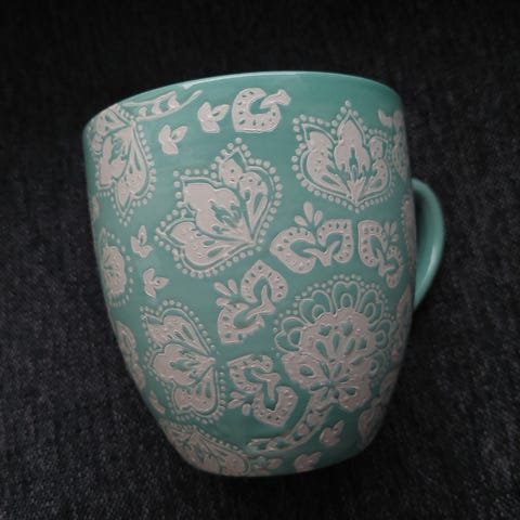 Indiska XL-muki, konepesun ja mikroaaltouunin kestävä.