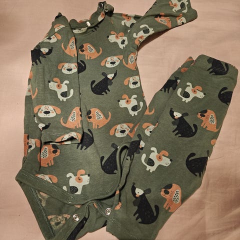 Lastenvaatteet setti, koko 62-68, väriltään kirjava. Setti sisältää kaksi pitkähihainen bodya ja kaksi housuparia.