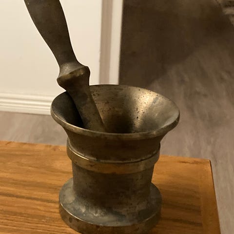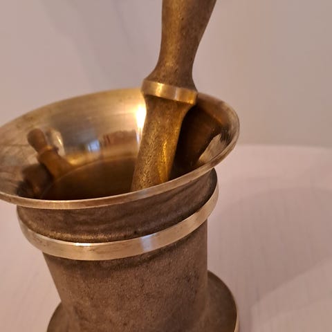 Kuvien yli 100 vuotias vanha messinki mortteli (huhmare). Korkeus on noin 10 cm. Hyväkuntoinen!