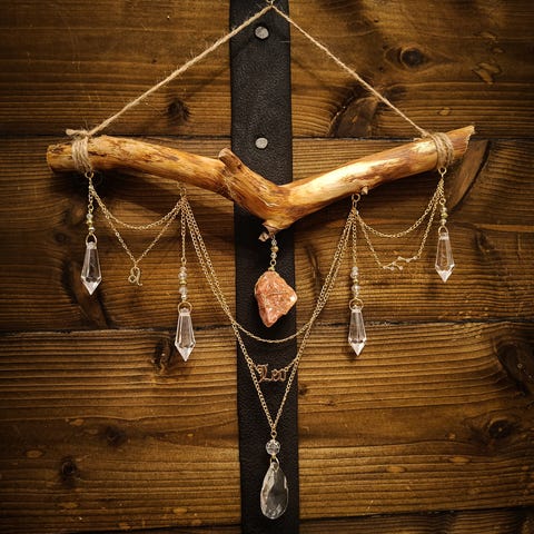 Itsetehty uniikki aurinkosieppari, joka tuo ripauksen taikaa kotiisi✨ Kaartuva männynoksa, jossa näyttäviä ketjuja sekä ruusukvartsikivi ja kuuriipus🌛
