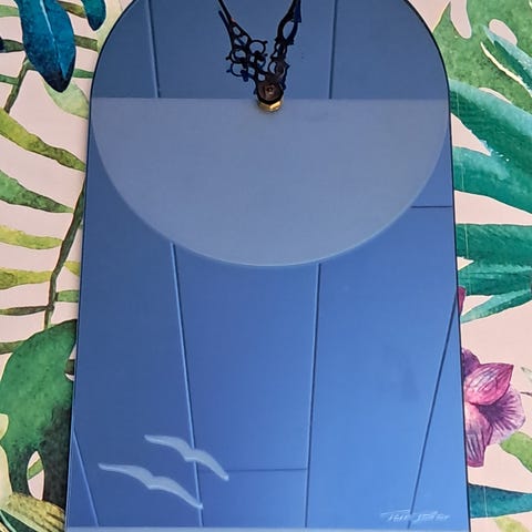 Toimiva seinäkello-peili ja taso, johon voi laittaa koristeita. Korkeus n. 180 cm, lev. 35 cm, hyllylevy lev. 20 cm.