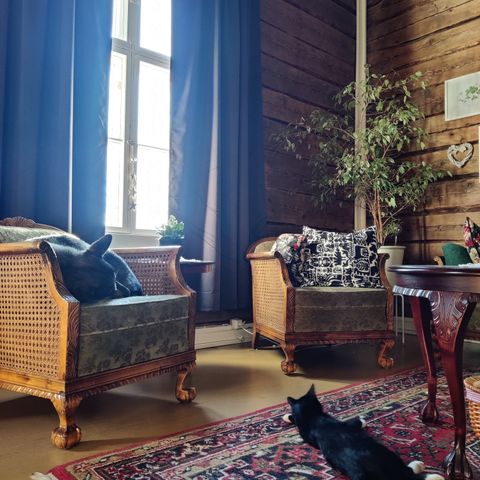 Hienokuntoinen ehjä Chippendaleryhmä, puhtaat kankaat ja rottingit. 2 nojatuolia, sohva ja lasipäällysteinen sohvapöytä