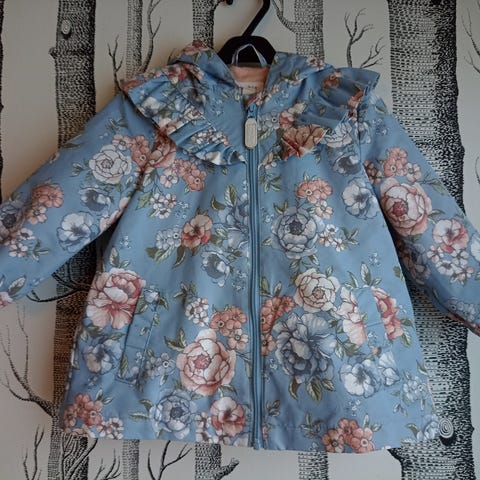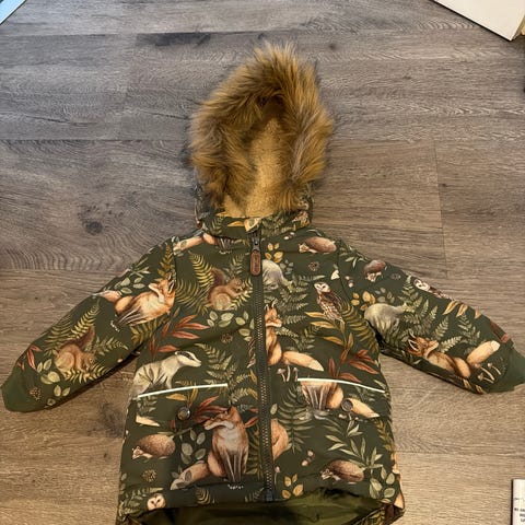 Käyttämätön talvitakki. Vaalean ruskea takki, jossa vaaleanpunaisia ruusuja. Karvareunus hupussa.