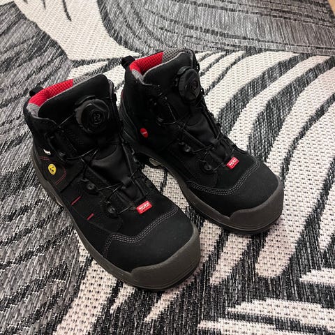 Jalaksen turvakengät, ehjät ja melko vähän pidetyt mutta käyttöympäristöstä johtuen vähän jo enemmän käytetyn näköiset. Turvakärki ja naulaanastumissuoja.