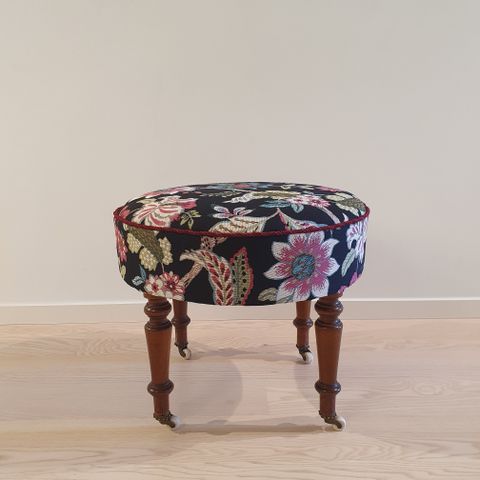 Tukeva ja patinoitunut vanha rahi, ostettu antiikkiliikkeestä 1980-luvun lopulla. Materiaali koivu ja kangas huonekalusametti.