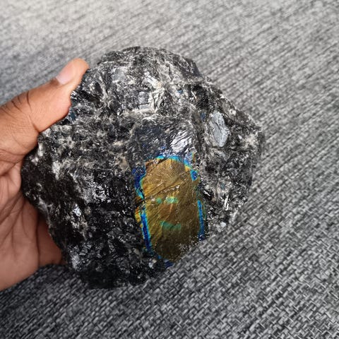 Myytävänä malakiittijalokivi. Koko noin 51×35 ja paksuus 8 mm.