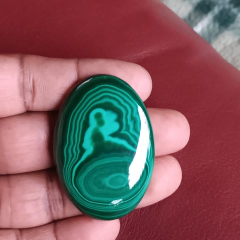 Myytävänä malakiittijalokivi. Koko noin 29×18 mm.
