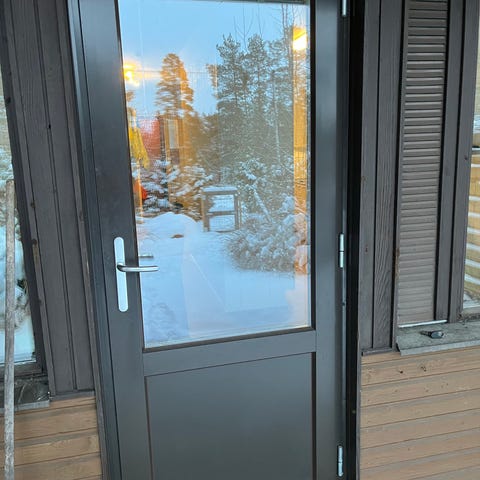 Hyvä kuntoinen ulko-ovi ja levike osa. Ovessa on ovi pumppu lukitus kahva sekä oven karmit.