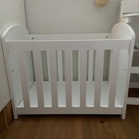 Valkoinen nuken sänky. Pientä käytön jälkeä näkyvissä.