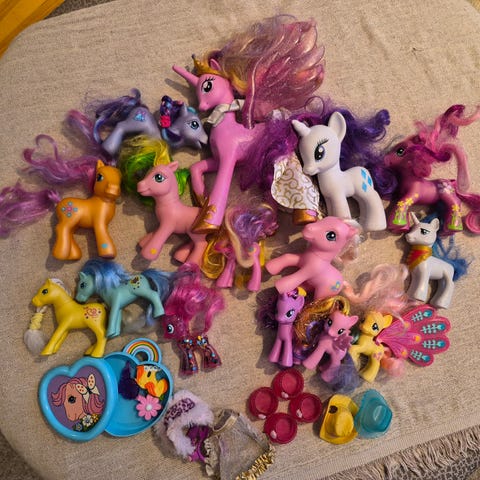 Myydään kuvan My Little Ponyt ja tarvikkeet kaikki kerralla. Mukana myös muutama poni, jotka ei ole My Little Ponyja. Leikitty kunto, osalla harjat ja hännät takussa. Kaikki ehjiä.