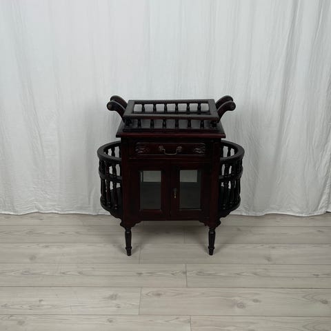 Myydään upea ja erittäin harvinainen täyspuinen baarikalusto, joka on tuotu Thaimaasta tilauksena. Koko kokonaisuus on käsintehtyä työtä ja kaiverrettu kauttaaltaan eläin- ja luontoaiheisin koristekuvioin (mm. elefantit, puut ja maisemat). Vastaavaa ei enää juurikaan valmisteta eikä tuoda Suomeen.