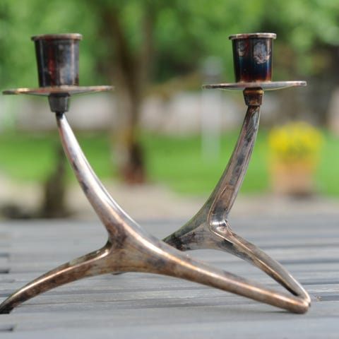 Anna-Greta Ekerin suunnittelema hopeinen kynttilänjalka, signeerattu. Yläosa hopeaa, alaosa tiikkiä. Hyvässä kunnossa, hopea luonnolliseen tapaan patinoitunut. Korkeus 11,5 cm. Hopealeimat: suomalaista 813-hopeaa, valmistettu Turussa 1960.
