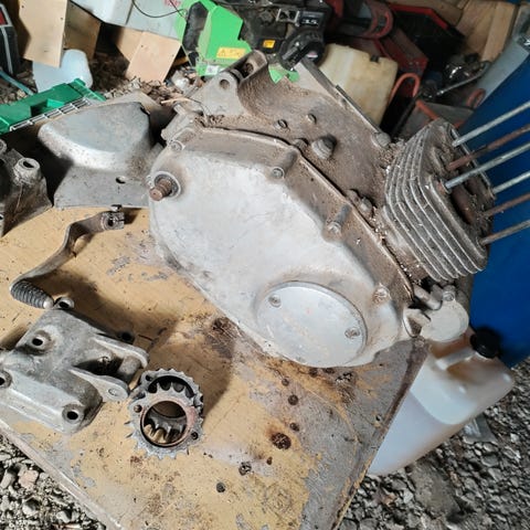Varaosiksi, ei papereita. Moottorin yläkerta puuttuu. Mukaan tehdastekoinen rosterinen tehoputki ja toinen takavanne.