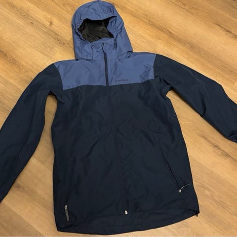 Takissa on vetoketjukiinnitys, irrotettava huppu ja kaksi vetoketjullista taskua. Lisäksi vetoketjullinen povitasku. Oikeassa hihassa siisti korjaus heijastinnauhalla, näkyy viimeisessä kuvassa