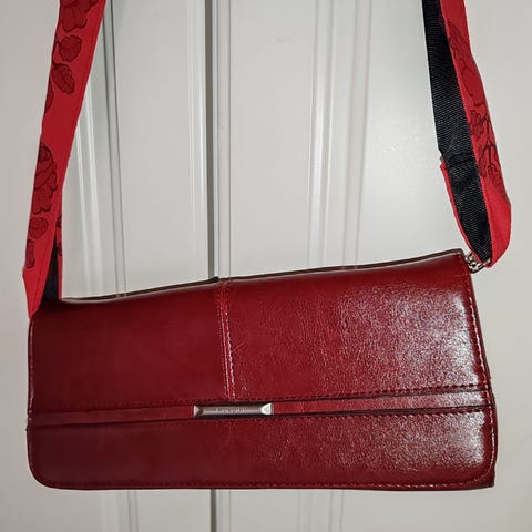 Pikkulaukku Puccini, uuden veroinen. Säädettävä olkahihna on ommeltu Marimekon vihkiruusu kankaasta. Laukun koko 26 x 13 cm, vetoketjutasku, nahkaa, vuori kuvassa. 35 € diili tai postit + 6,90