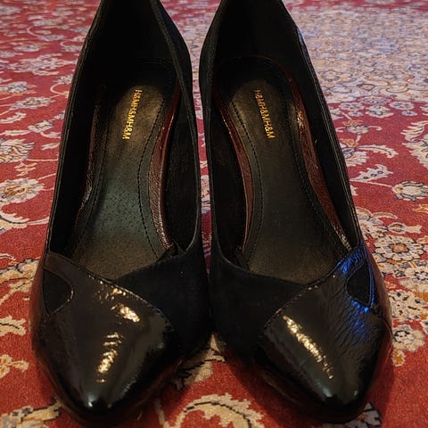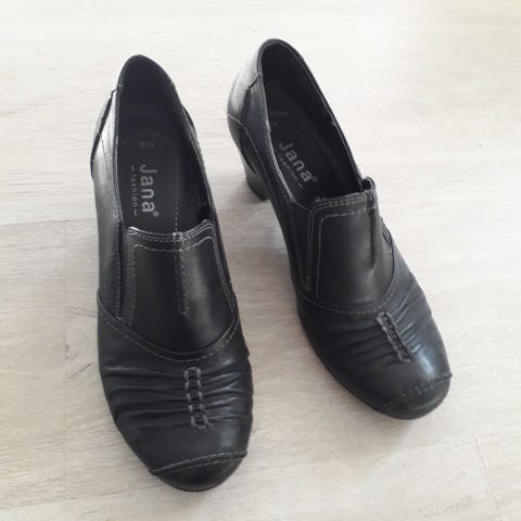 Mustat leveä kantaiset juhlakengät. Materiaali on elastista tekstiiliä ja keinonahkaa. Oikean jalan kengän kärjessä on pieni naarmu, josta on kuva. Kengät ovat kokoa 5,5, aika kapea lestiset. Kenkiä ei ole juurikaan käytetty.
