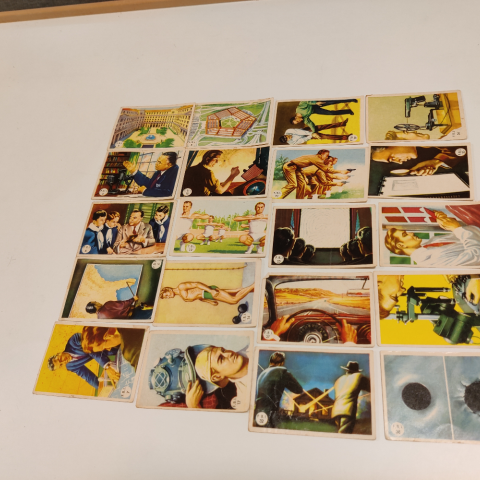 Kaupan uuteen keräilijäkotiin olisi iso pino erilaisia purukumien yms. makeisten mukana tulleita 60-luvun keräilykortteja, isäni vanhoja. Kunto suurimmilta osin varsin hyvä, ja osasta kortteja on tuplakappaleita tai joitakin jopa 3-4-5 samanlaista. Jos kortista on useampi kappale, olen asettanut sen kuvassa hieman sivuittain.